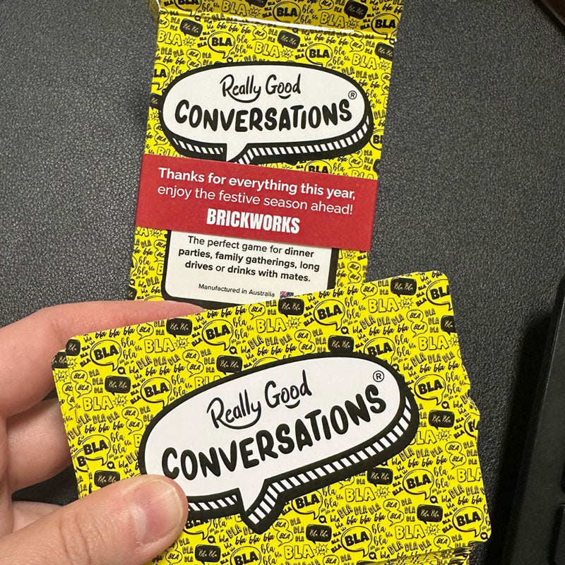 In the world of corporate engagement and networking, leaving a lasting impression is paramount. We offer unique co-branded opportunities to add your logo, slogan or a tailored message to packs of Really Good Conversations as corporate gifts for staff and clients alike.
